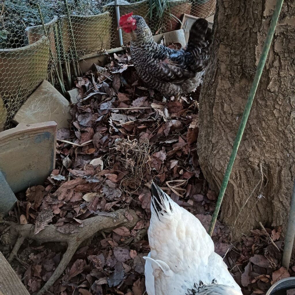 秋の日。小屋内の土がカチカチになっていたので落ち葉を敷き詰める。