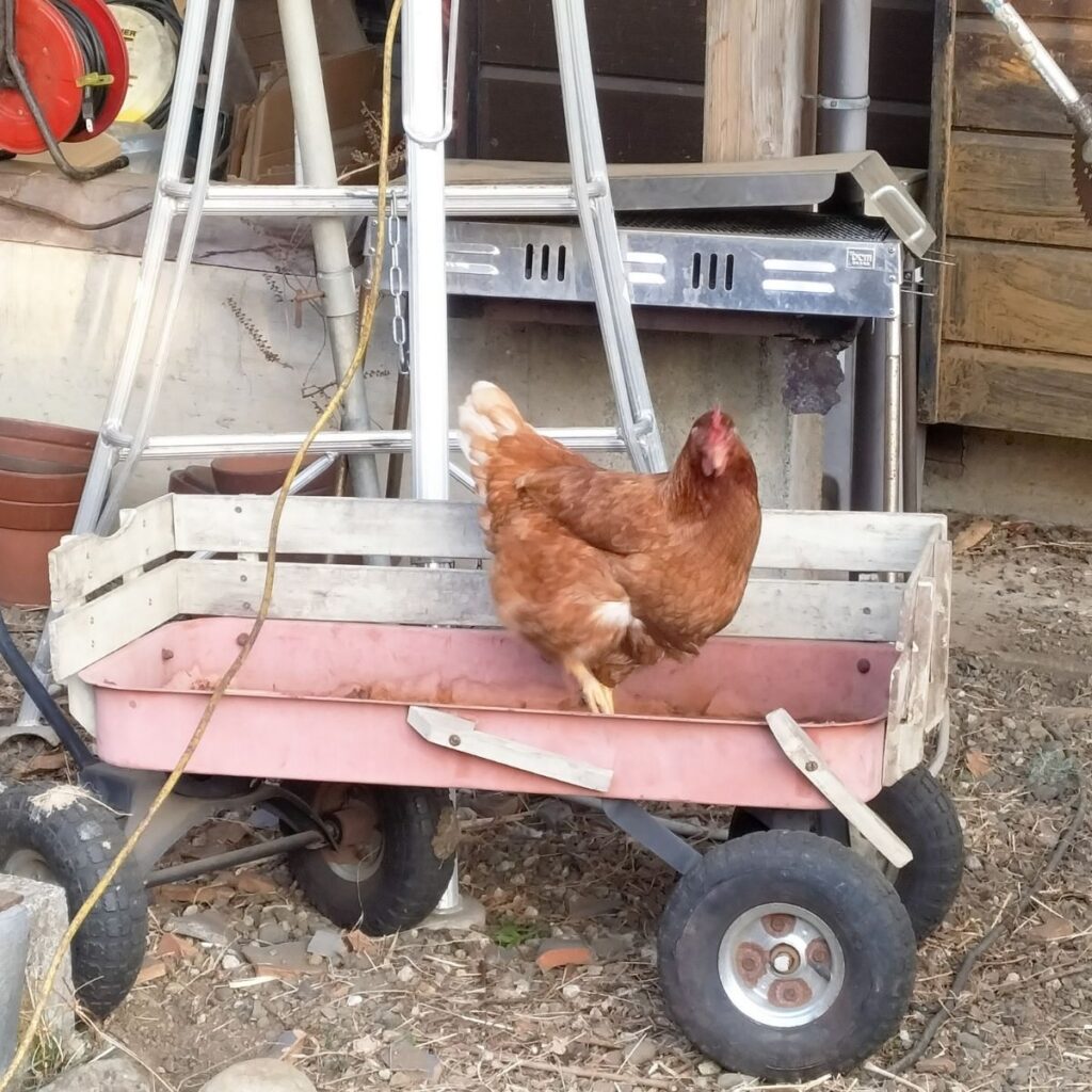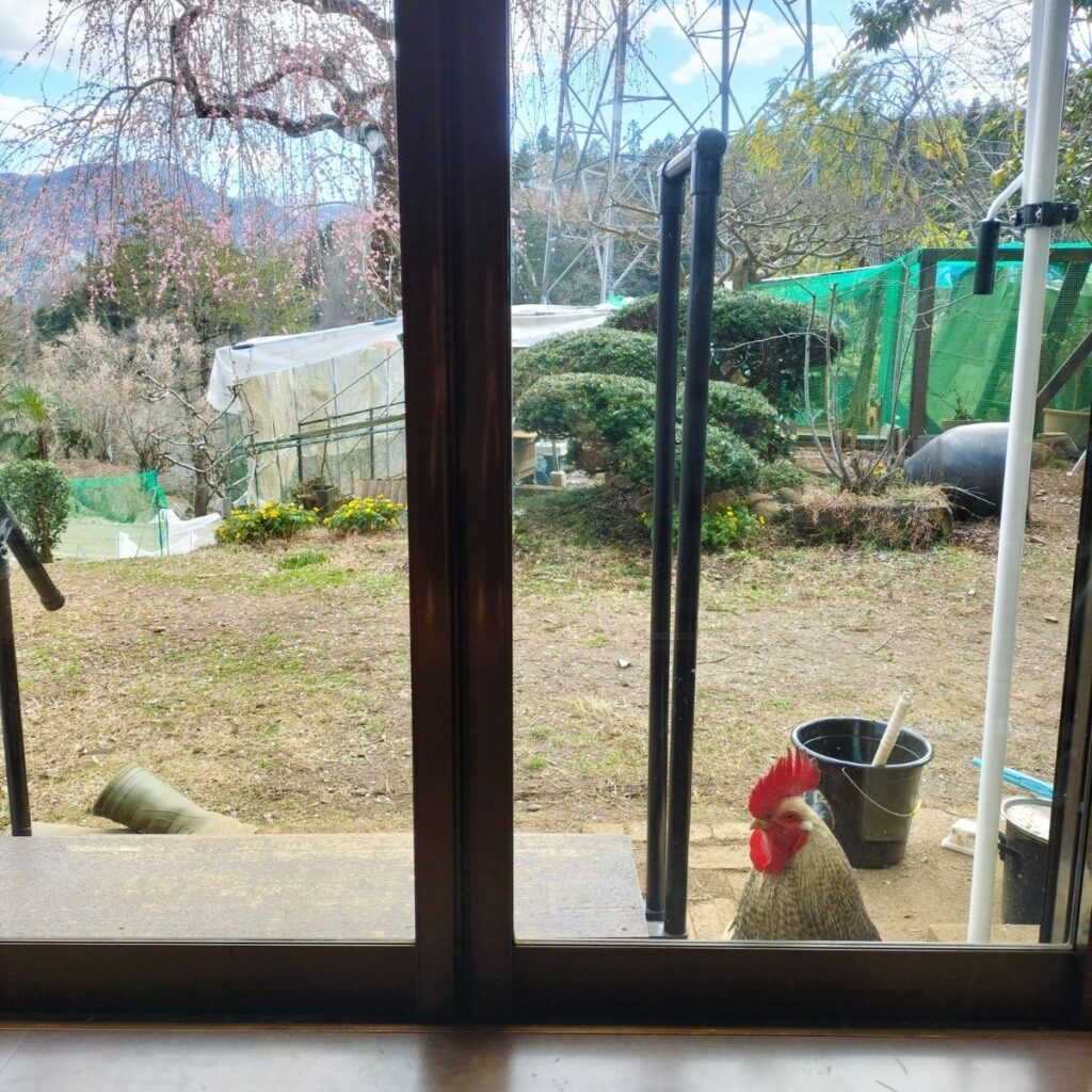 めんどりたちが畑で遊んでいるところを見通しのきくところから見守るハナ吉。頼れるリーダー。