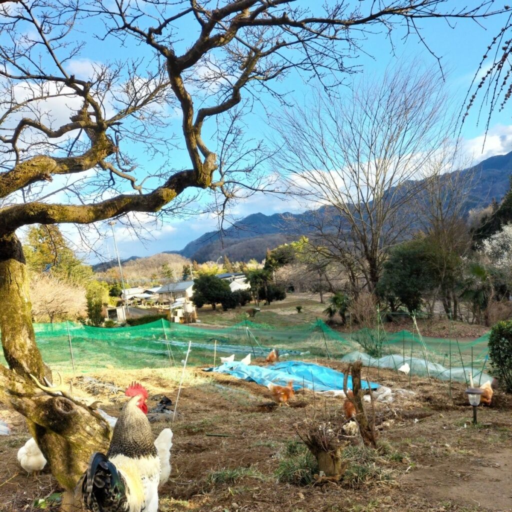 鶏たちが自由に動き回れる平飼い環境。土の地面で梅の木やブランコなどの遊び場、雑草などが生えるよう、秋には落ち葉などを入れてかちかちの土がそのまま露出しないようにしています。ストレスが少なく、小屋の中でも自然な行動ができるようにしています。